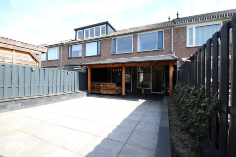 Begane grond: Voortuin. Entree met kapstok en wc. Deur naar grote woonkamer met openslaande deuren naar de betegelde achtertuin met achterin een veranda. Moderne, open keuken met inductie kookplaat, koel- vriescombinatie, combi-magnetron en afwasmachine.