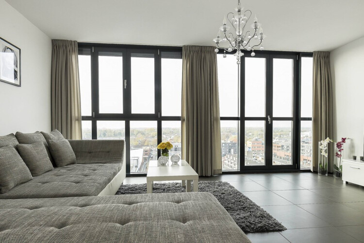 Strak moderne woon-/eetkamer met prachtig uitzicht over de stad en wijde omgeving!