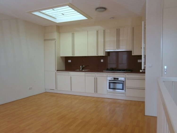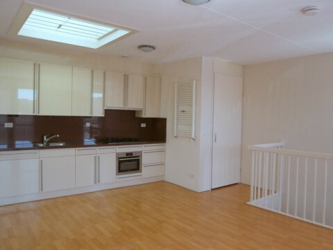 1e verdieping: open woonkamer (ca. 5.60 x 4.05 m.) met laminaatvloer, ramen aan 2 zijden met frans balkon en daklicht boven de open keuken. Ruime bergkast met CV-installatie.