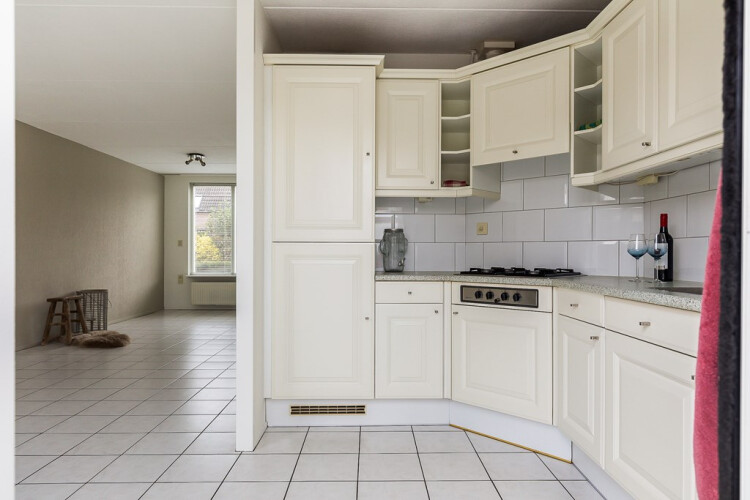 Vanuit de keuken toegang tot de zonnige en onderhoudsvriendelijke achtertuin met berging en achterom.