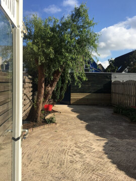 Begane grond: Entree met meterkast, lichte woonkamer, open keuken met diverse inbouw apparatuur. Toegang tot ruime tuin op het westen met houten berging.